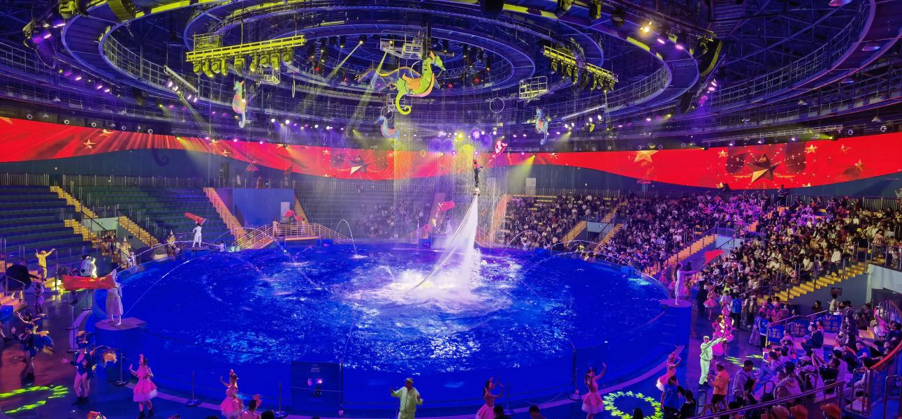 艾比森多款產(chǎn)品亮相中原首個旗艦級海洋主題文旅度假區(qū)——鄭州海昌海洋公園,為海豚館打造數(shù)字化創(chuàng)意演藝空間,使其成為國內(nèi)唯一的360°環(huán)形全景的海豚秀場。