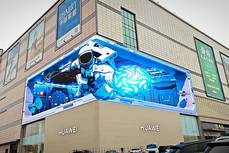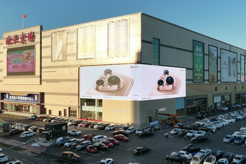 落位于全球單體規模最大的商業綜合體——長春歐亞賣場(60萬㎡),艾比森A25系列打造770㎡ 90°直角折角裸眼3D大屏,總分辨率高達13896×2808,為東北戶外最高清的LED屏。該屏無縫融入華為智能生活館門頭,成為品牌科技美學的視覺封面,實現雙面可視、街區引爆。