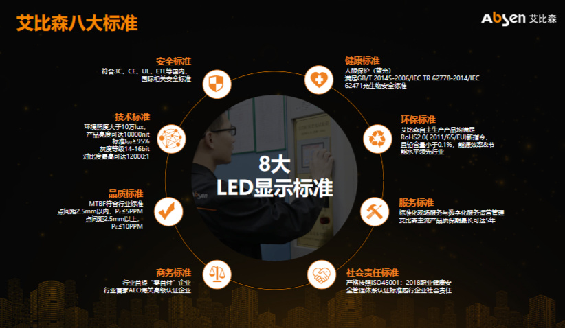 12月,艾比森8大LED顯示標(biāo)準(zhǔn)正式發(fā)布,從安全、健康、環(huán)保、品質(zhì)、技術(shù)、服務(wù)、商務(wù)、社會責(zé)任等維度深度思考LED顯示行業(yè)可持續(xù)發(fā)展良策,對企業(yè)生產(chǎn)經(jīng)營活動進(jìn)行了全流程、全方位的規(guī)范。
