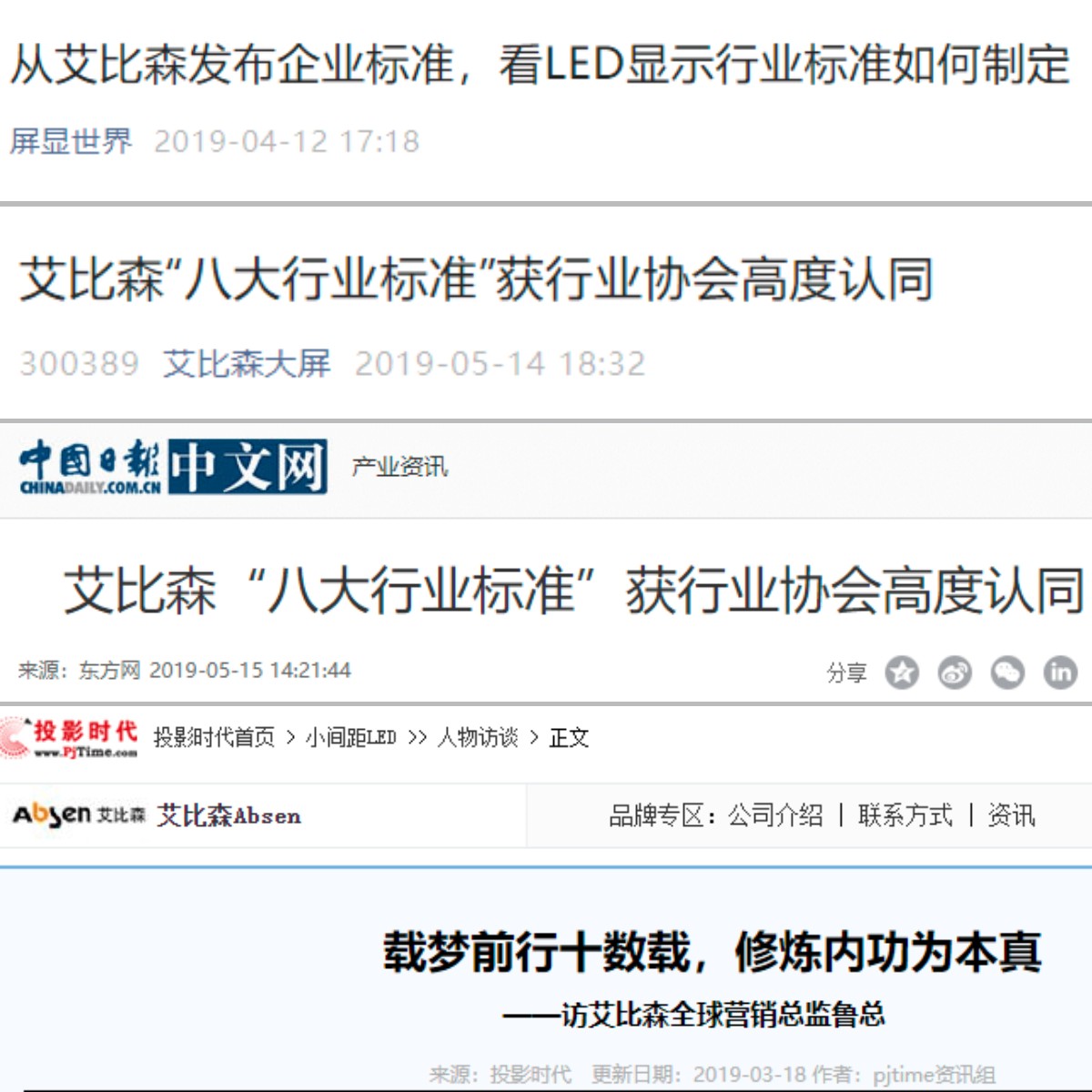 3月-5月,全國各大媒體爭相報道,艾比森8大顯示標(biāo)準(zhǔn)獲得包括中國光學(xué)光電子行業(yè)協(xié)會LED顯示應(yīng)用分會在內(nèi)的多方認(rèn)可。