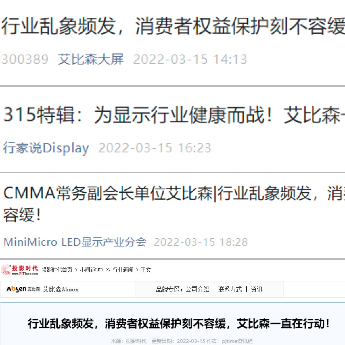 3月15日,2022年國際消費(fèi)者權(quán)益日,艾比森直面行業(yè)亂象,呼吁業(yè)界同仁重視產(chǎn)品品質(zhì),切實(shí)保障消費(fèi)者權(quán)益,品牌整機(jī)價值再次彰顯。八十余家媒體相繼轉(zhuǎn)載報道。