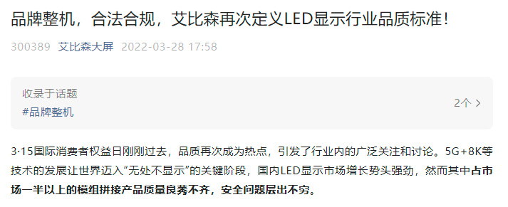 3月28日,艾比森持續(xù)發(fā)聲,詳解品牌整機(jī)合法合規(guī)之道,再次定義LED顯示行業(yè)品質(zhì)標(biāo)準(zhǔn)。