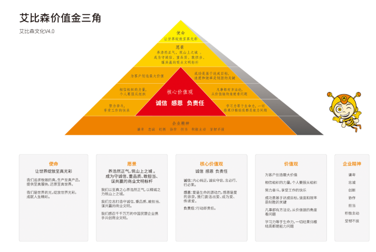 價(jià)值金三角作為意識(shí)形態(tài)理念,是我們企業(yè)的靈魂及核心所在。代表著艾比森的軟實(shí)力,讓艾比森具有區(qū)別于其他企業(yè)的不同之處。艾比森價(jià)值金三角存在于員工的潛意識(shí),成為艾比森人為人處世的判斷標(biāo)準(zhǔn),為艾比森人提供了工作準(zhǔn)則和忠實(shí)的職業(yè)信仰。價(jià)值金三角的存在正是艾比森企業(yè)文化管理中所表現(xiàn)出來(lái)的最大特色。