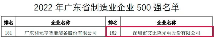 艾比森憑借穩健增長的經營勢頭、領先的智造能力和優秀的市場表現成功入選,位居榜單第182位。