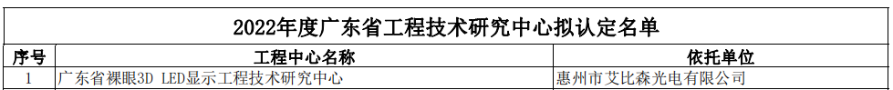 近日,廣東省科學技術廳對2022年度廣東省工程技術研究中心名單進行了公示,惠州市艾比森光電有限公司榮獲“廣東省裸眼3D LED顯示工程技術研究中心”認定。