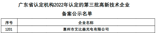 近日,全國高新技術企業認定管理工作領導小組辦公室對廣東省2022年第三批認定報備高新技術企業名單進行了公示。經過層層篩選和嚴格審核,惠州市艾比森光電有限公司正式被認定為“國家高新技術企業”。