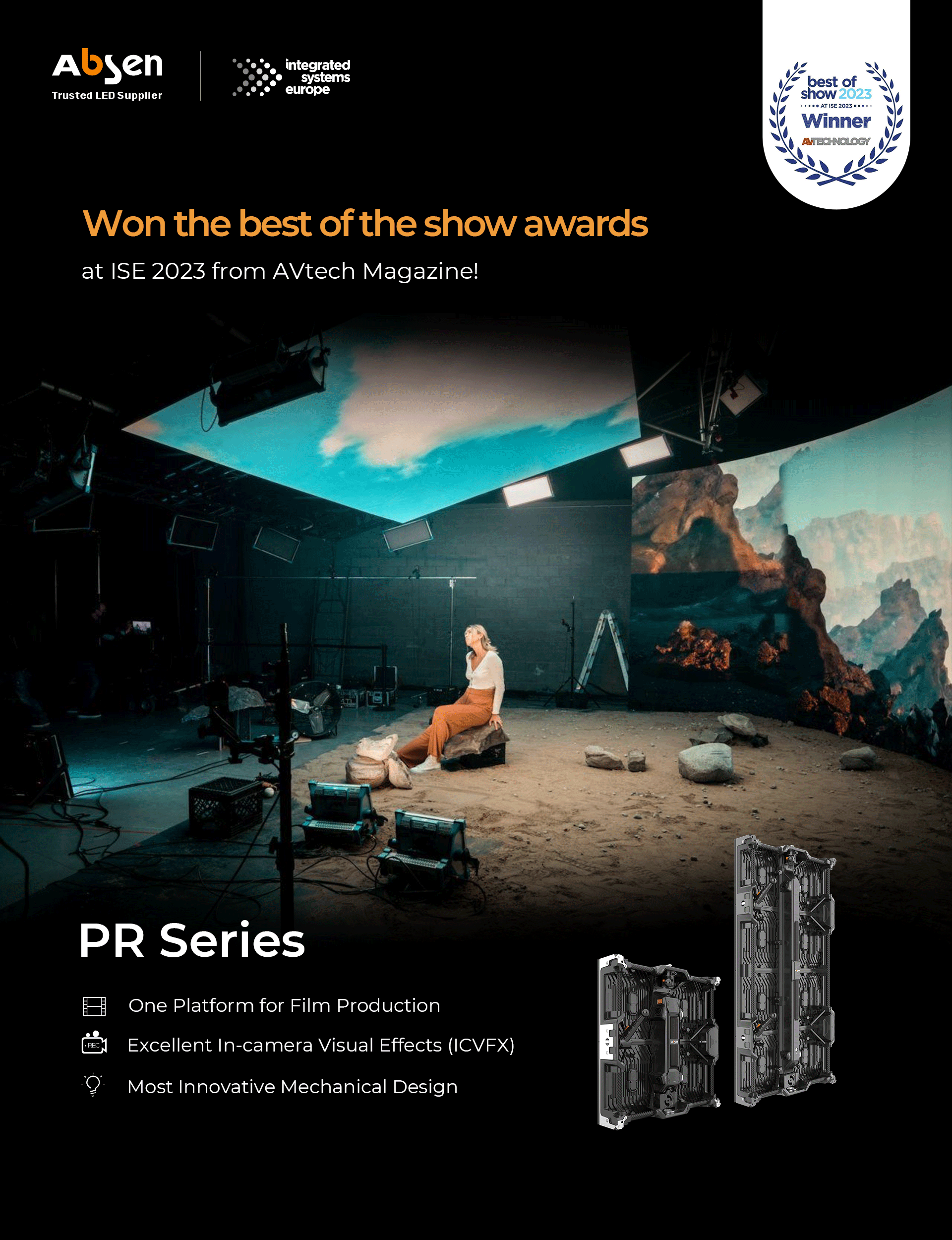 當前,虛擬制作正在深刻改變電影和電視的制作方式。艾比森致力于推動LED虛擬攝影棚的應用,為影視行業強勢賦能。備受專業客戶認可的LED虛擬影棚解決方案在ISE現場大放異彩,其中,專為影視虛擬制作場景研發的新產品PR系列首次登陸國際大展便表現不俗,榮獲Best of Show大獎。