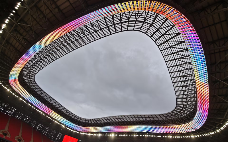穆萊·阿卜杜拉王子體育場建筑結構復雜,頂部呈非標準圓形,存在多處凹凸弧線,對顯示產品的適配性提出極高挑戰。面對這一難題,艾比森團隊通過創新的鋼結構設計,將標準A1025模組精準嵌入異形空間,實現360°無死角環繞覆蓋。整套顯示系統如光環般貼合體育場穹頂輪廓,既保留了建筑原有的美學特征,又賦予其前所未有的數字生命力。