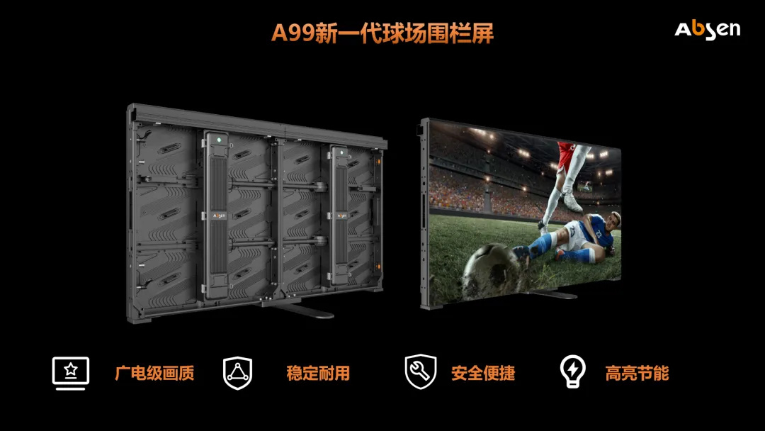 頂級賽事顯示標桿-A99系列:A99系列是專為頂級體育賽事打造的新一代球場圍欄屏,全面符合UEFA/FIFA標準。產品搭載7000nit超高亮度與7680Hz超高刷新率,無懼戶外強光,支持4K高速賽事轉播,呈現(xiàn)清晰流暢、色彩真實的廣電級畫質。采用一體壓鑄鋁箱體與IP65全面防護設計,結構堅固耐用。系統(tǒng)雙備份設計,確保直播信號持續(xù)穩(wěn)定,為賽事呈現(xiàn)提供可靠保障。