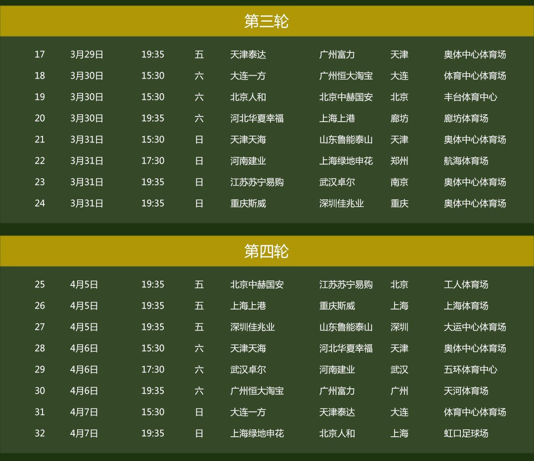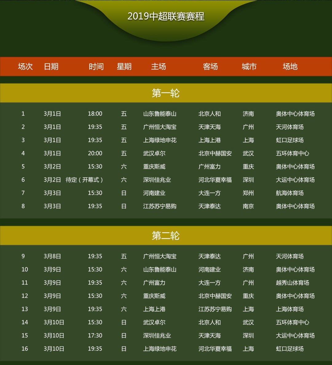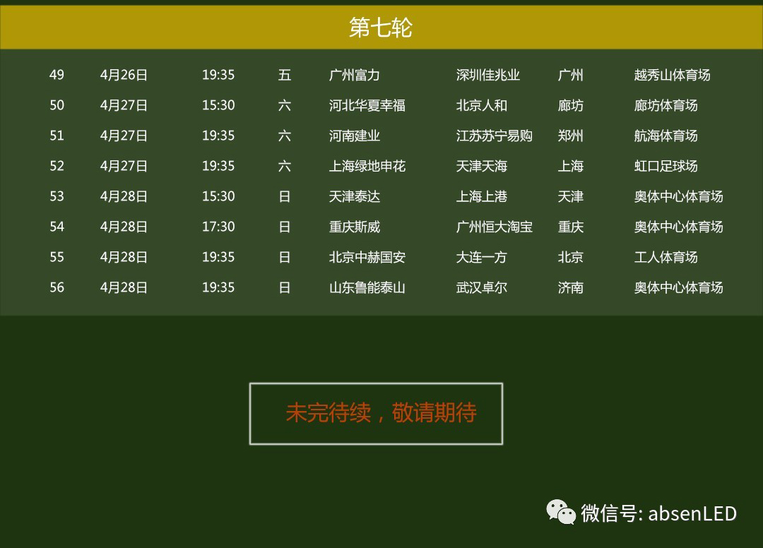 3月1日,2019中超戰火重燃,上港失去最佳射手武磊能否衛冕冠軍,注入新鮮血液的恒大能否重奪冠軍,深足重返中超會有怎樣的表現等令人無比關注。作為中超聯賽2017-2021年官方LED顯示屏供應商,艾比森奉上第一季(3月1日-4月28日)詳盡賽程表,趕緊收藏起來,精彩賽事不容錯過!