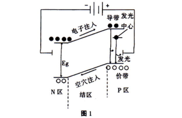 發光二極管是由Ⅲ-Ⅳ族化合物,如GaAs(砷化鎵)、GaP(磷化鎵)、GaAsP(磷砷化鎵)等半導體制成的,其核心是PN結。因此它具有一般P-N結的I-N特性,即正向導通,反向截止、擊穿特性。此外,在一定條件下,它還具有發光特性。在正向電壓下,電子由N區注入P區,空穴由P區注入N區。進入對方區域的少數載流子(少子)一部分與多數載流子(多子)復合而發光,如圖1所示。